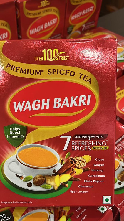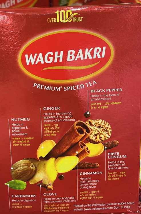این چای Wagh Bakri Premium Spiced Tea در واقع یک چای ماسالا هندی (Masala Chai) با ترکیب ۷ ادویهٔ گرم و دارویی است. روی جعبه هم نوشته: 7 Refreshing Spices یعنی «۷ ادویهٔ نشاطبخش».
