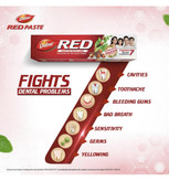 خمیر قرمز دابور دارای فرمول ثابت شده بالینی است که با 7 مشکل دندانی 1) دندان درد، 2) حفره ها، 3) پلاک، 4) میکروب ها، 5) بوی بد دهان، 6) زردی و 7) خونریزی لثه مبارزه می کند.