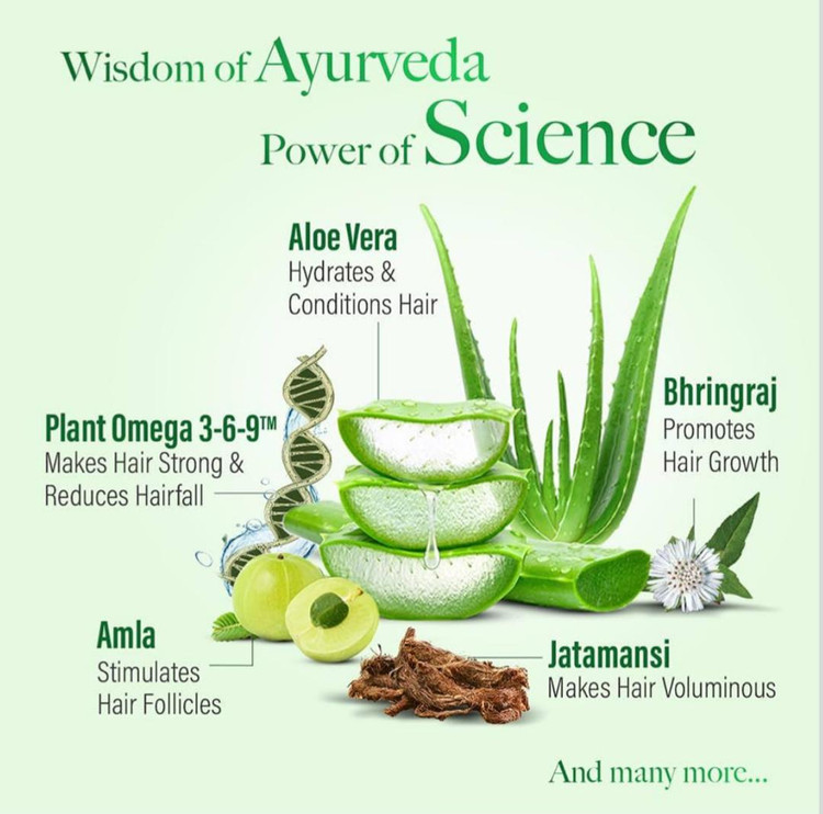 ترکیبات قدرتمند آیورودا: فرموله شده با 21 گیاه آیورودا، از جمله آلوئه ورا و بهینگرجا، که به دلیل خواص تقویتکننده و ترمیمکننده مو شناخته شدهاند.